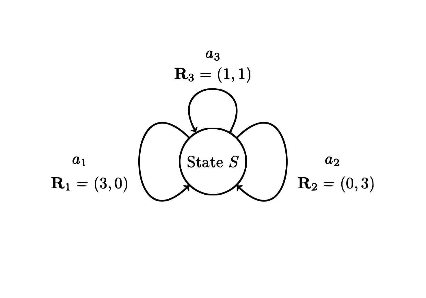 The major difference to the traditional MDP’s is the inclusion of vector valued reward function \(\mathbf{R}: S \times A \times S \rightarrow \mathbb{R}^d\), where \(d \geq 2\) is the number of objectives.